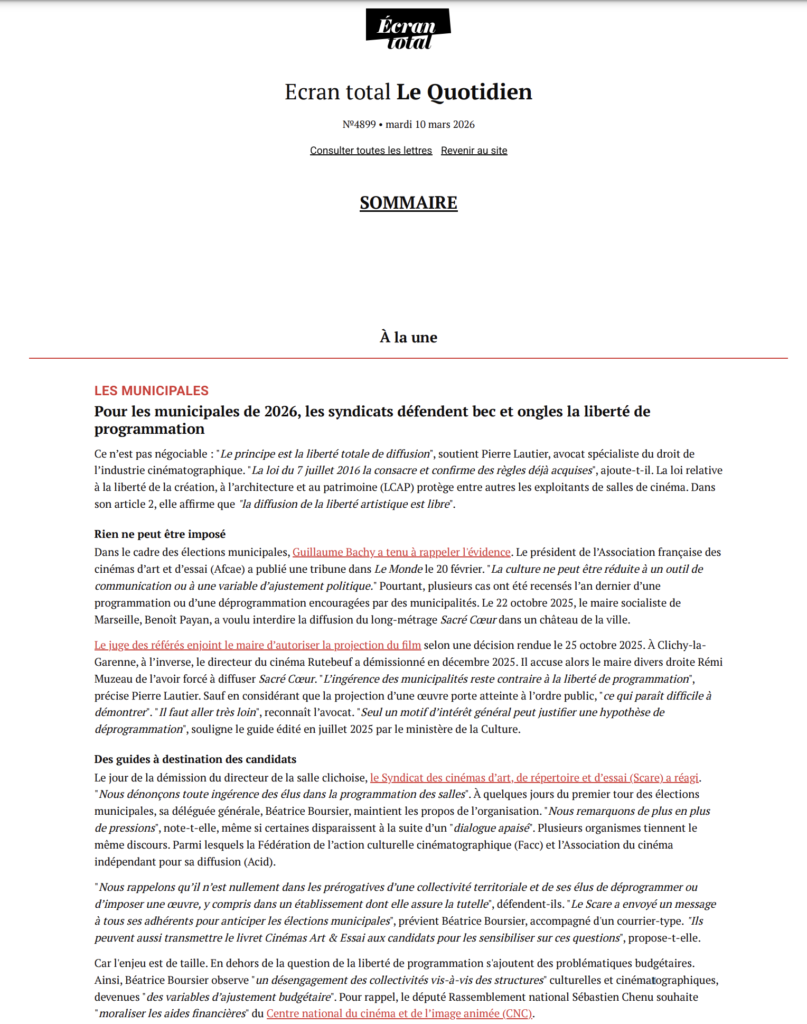 Interview de Pierre Lautier dans Écran Total sur la liberté de programmation des salles de cinéma